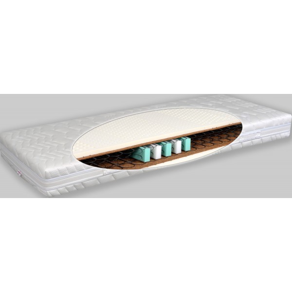 Pružinové jadro s kokosovou roznášacou vrstvou a 7-zónovou latexovou doskou je rokmi potvrdená kvalita. Použité prírodné materiály sú veľmi dobre vzdušné, čo podporuje aj poťahová látka zo 100% bavlny najvyššej kvality. Výška cca 19 cm.