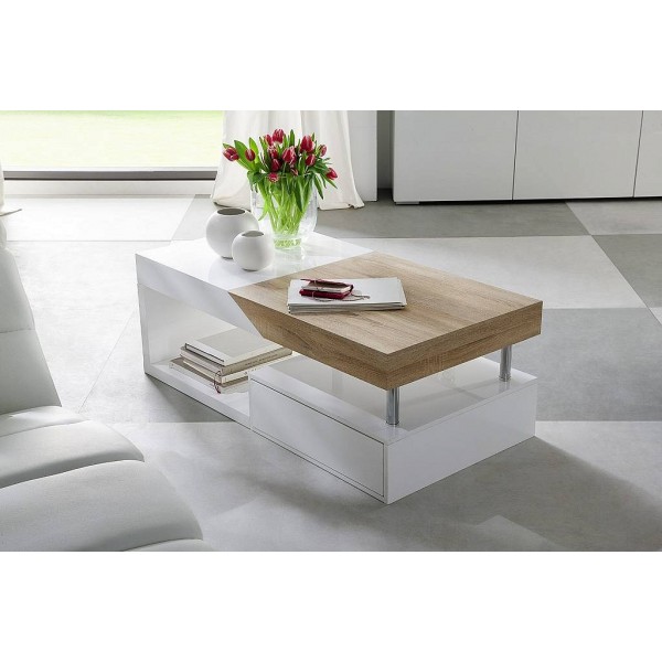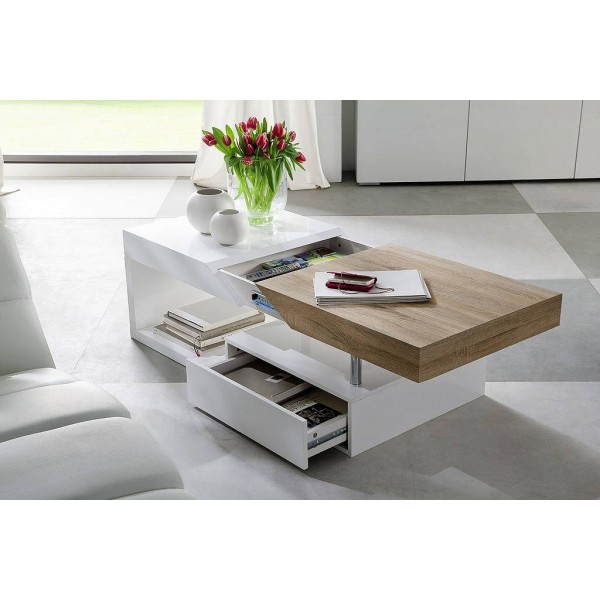 Stolík prekvapuje neobvyklou štruktúrou a skvelými funkciami. Konferenčný stolík má police, zásuvku a úložný priestor skrytý pod posuvnou vrchnou doskou.